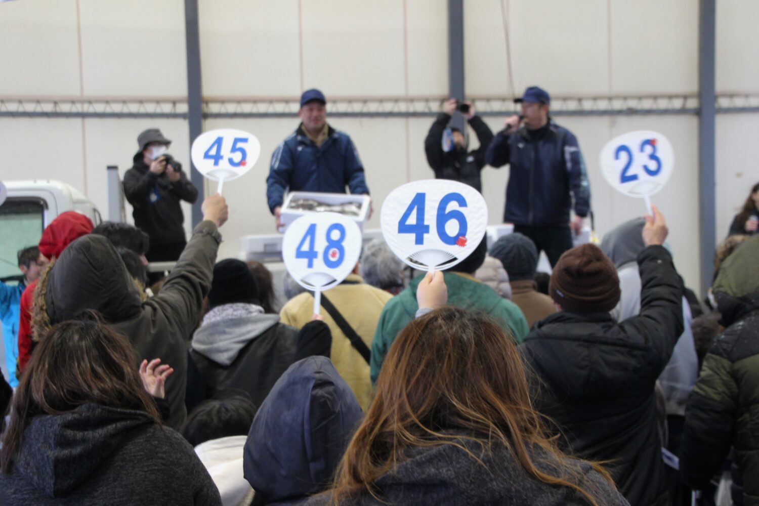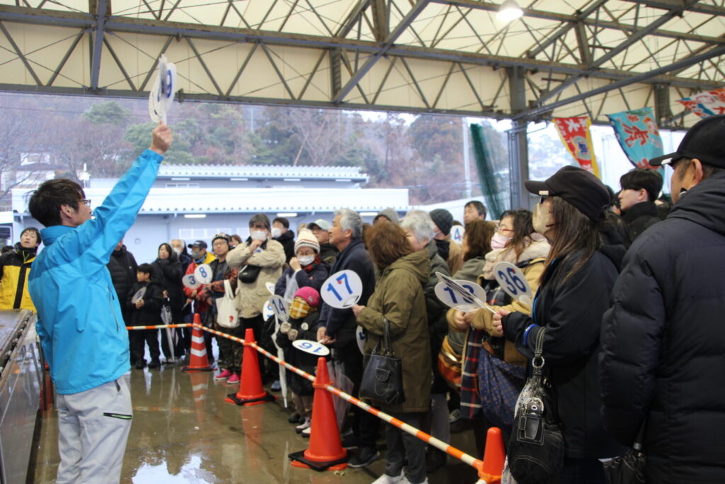 参加者は、番号の書かれたうちわを手に持ち、売り主(スタッフ)の掛け声に合わせてうちわを掲げ、欲しい商品を競り落とします🌟