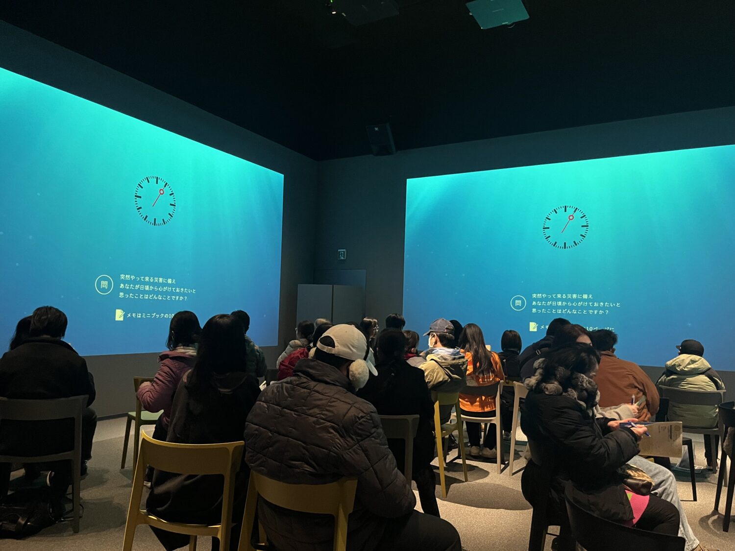 ここでは、町民たちが当時を振り返った話をしている動画を見ながら、その間に出てくる問いかけに参加者が周りの人たちと一緒に話し合い、防災について”自分ごと”として考える内容になっています。