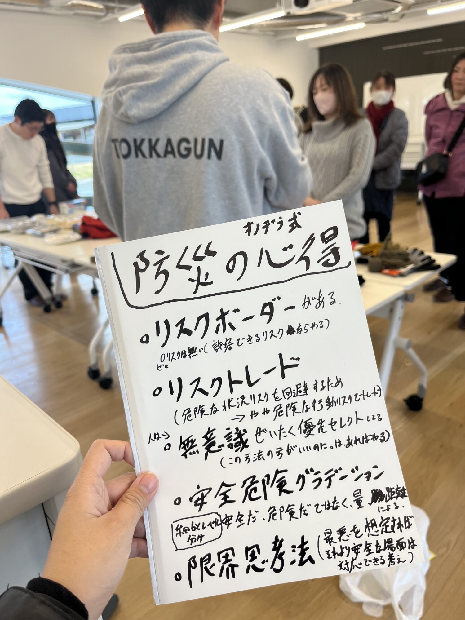 ワークショップ開催と同時に配られたのは、手書きの防災の心得。
