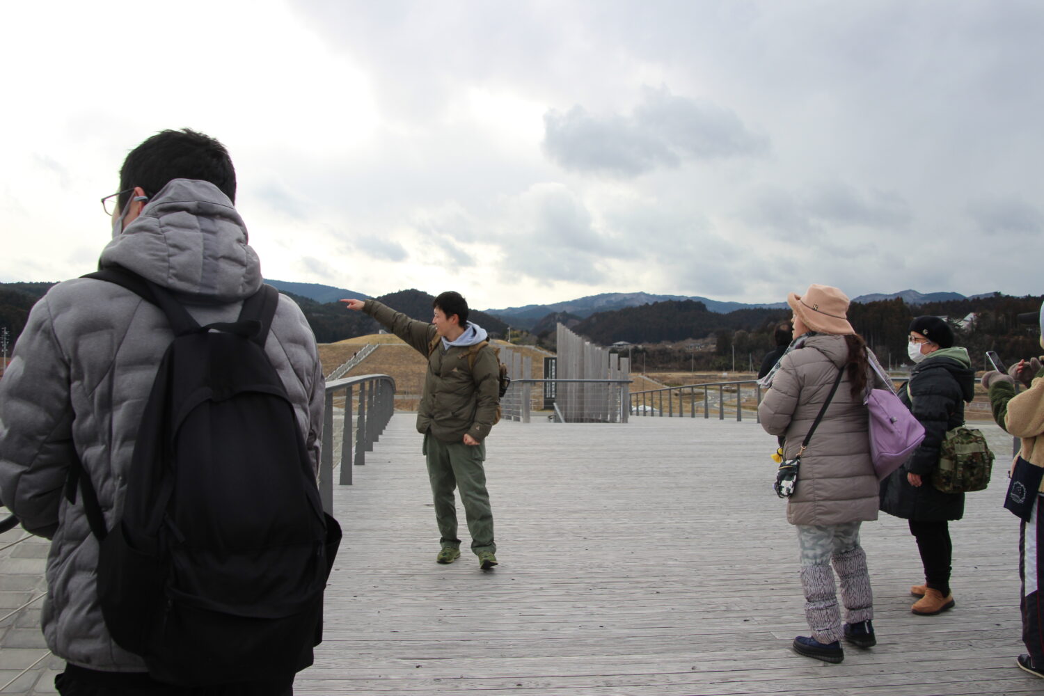 祈念公園に向かう橋の上で、トッカグンならではの解説に耳を傾けながら町を参加者のみなさんで一緒に見渡しました。祈念公園にかかる橋の下に通る川がなぜその設計なのか?そんなクイズなども織り交ぜながら、自然災害についての知識を深めていきました。
