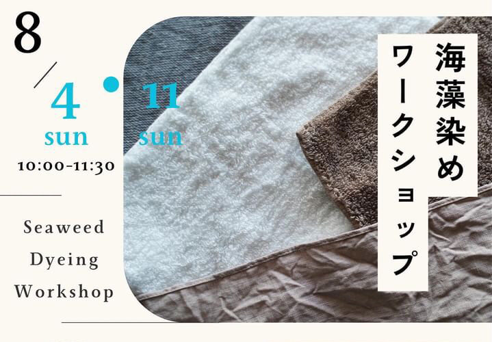 漂着した海藻を素材に海藻染めのワークショップを開催します。天然の海藻から抽出された染色液を使って、ハンドタオルを染めます。染色に必要な海藻は、その時々に漂着した流れ藻(ながれも)を利用します。