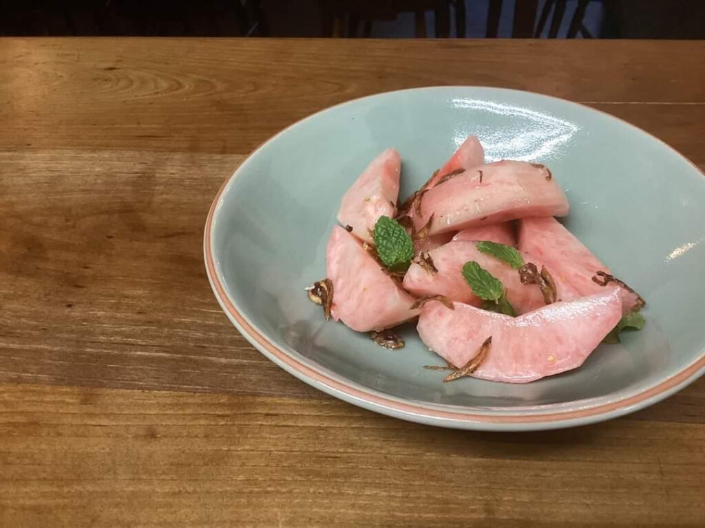 桃のタイ風サラダとして提供されています。タイ式の味付けと桃の甘さが絶妙にマッチ🍑白ワインとの相性ばっちりです🍷