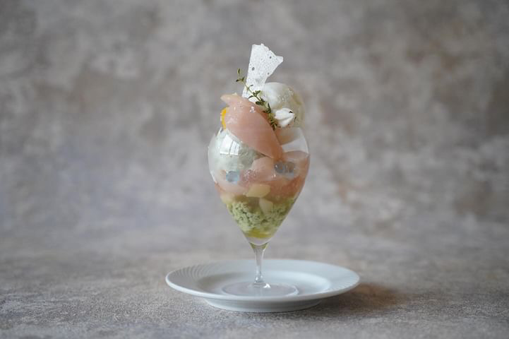 今年4月にオープンした海藻専門店。大人気のSEASONパフェをベースに、生の桃のフローズン、コンポート、寒天、アガージュレなど桃の魅力を堪能できるパフェ。8/16(金)より提供開始。