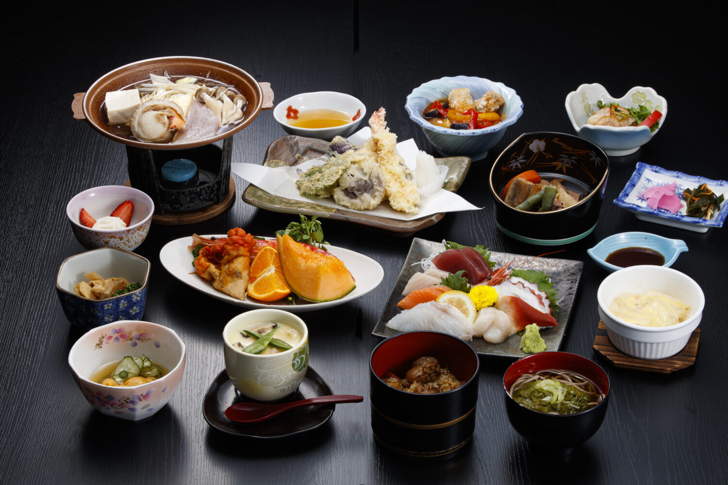 先付け、前菜、お刺身、季節のお鍋など約13品のお膳
