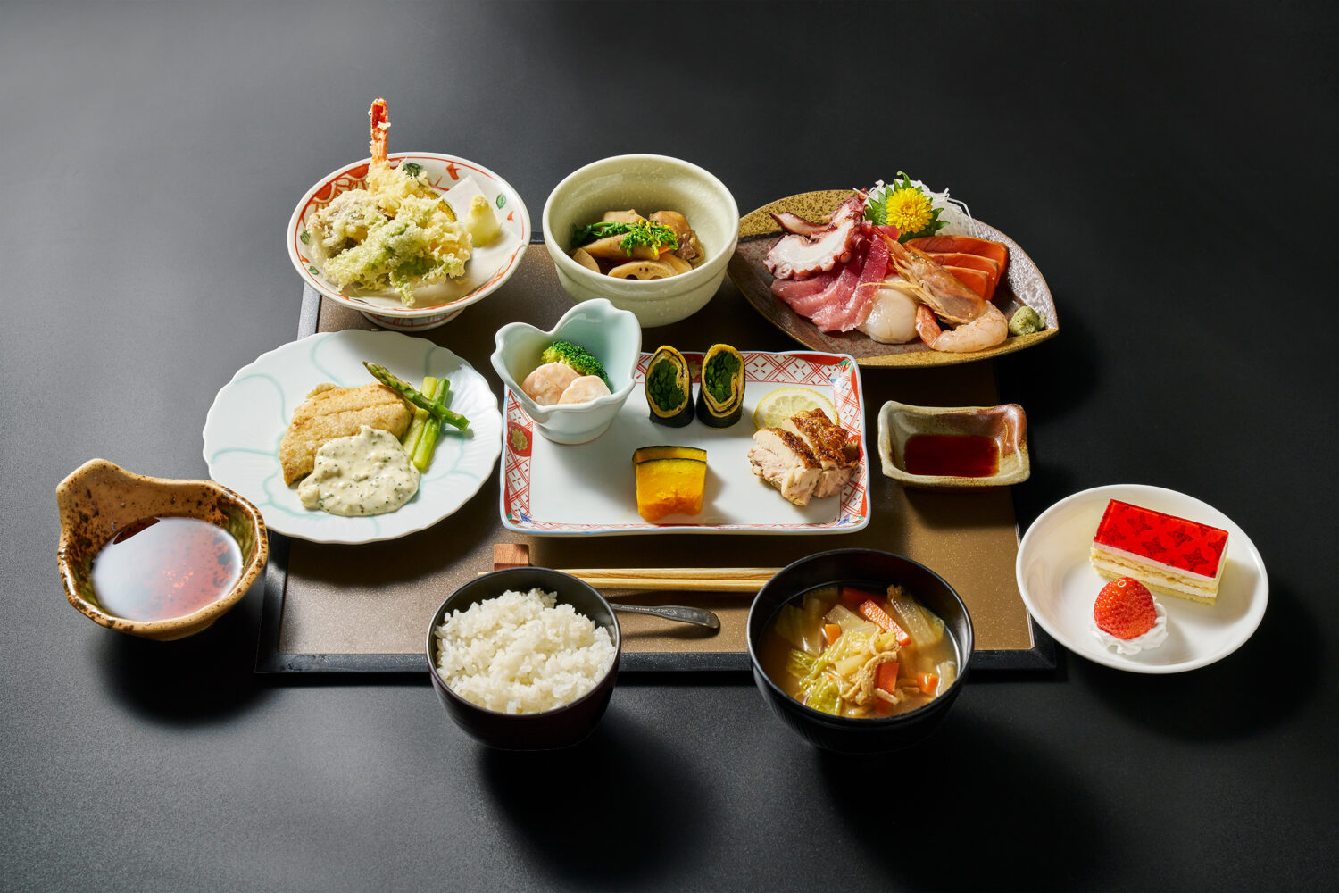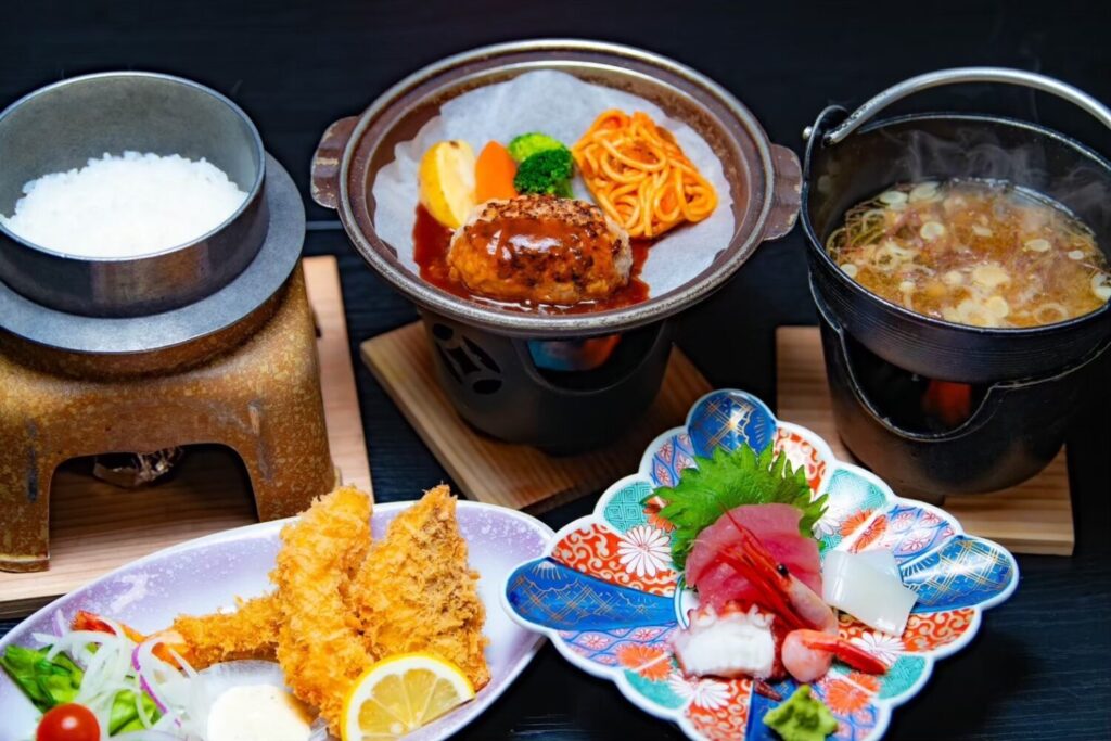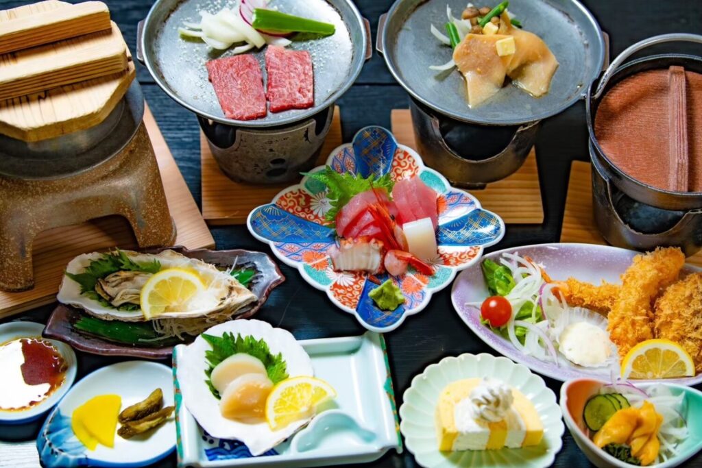 季節の海鮮や黒毛和牛、モウカザメのステーキなど、地場の食材をふんだんに用いた贅沢御膳