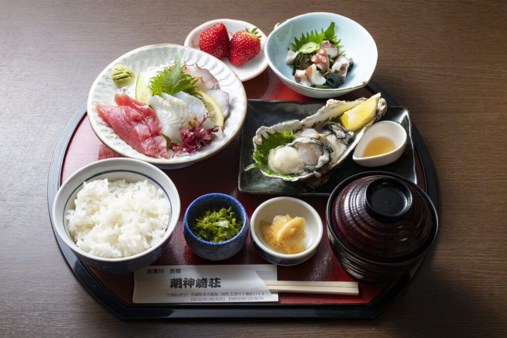 地元入谷産のご飯と志津川湾のタコや銀鮭。山と海の幸の両方を味わえる御膳です