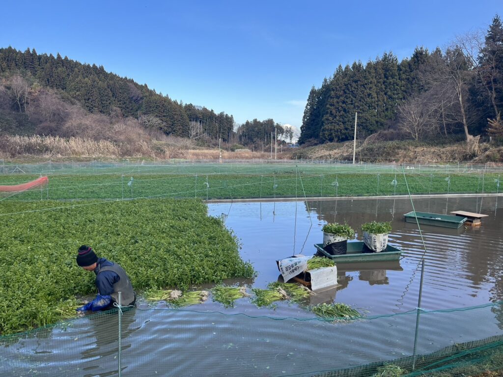 南三陸町全域で11軒の方々が栽培されていますが、今回は戸倉のセリ農家さんを取材させていただきました!セリは、元々田んぼだった場所を活かし、水を張って、種をまいて成長したものを収穫します。