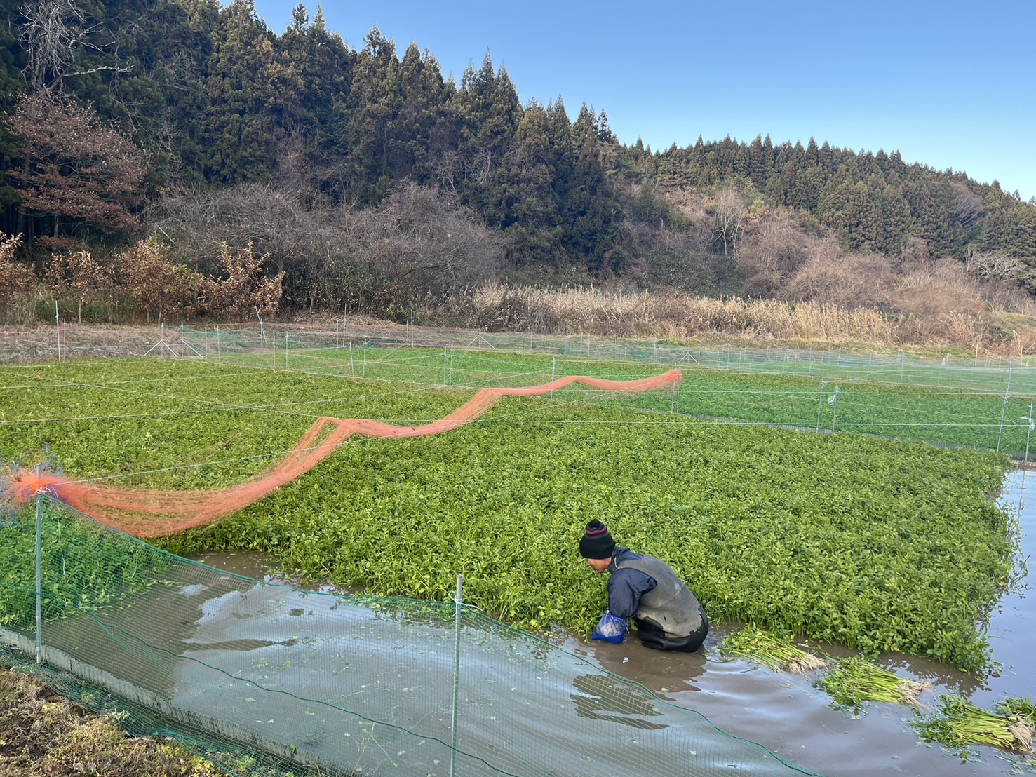 南三陸町全域で11軒の方々が栽培されていますが、今回は戸倉のセリ農家さんを取材させていただきました!セリは、元々田んぼだった場所を活かし、水を張って、種をまいて成長したものを収穫します。