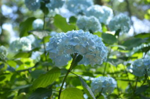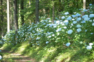 「行者の道」もいよいよ終盤に差し掛かると、あじさい園が現れます。例年7月中旬頃には、青や水色で統一されたブルー系統のあじさいや紫色のあじさいが鮮やかに咲き誇り、訪れる人々の目を楽しませてくれます。