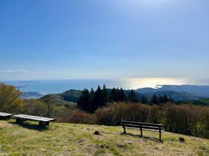 山頂に到着すると、目の前には太平洋の雄大なパノラマが広がります。田束山は、奥州藤原氏との関連も深い史跡「経塚」が残る信仰の山でもあります。