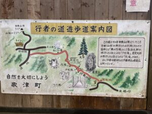 穴滝を過ぎると、木のベンチが置かれた休憩所が見えてきます。ここは「行者の道」の約半分、700m地点。少し一息入れるのにちょうどいい場所です。
