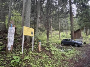 「行者の道」のスタート地点には、車を約5台ほど停められる駐車スペースがあります。トイレも設置されていますので、散策前にご利用ください(※冬季は閉鎖となります)。