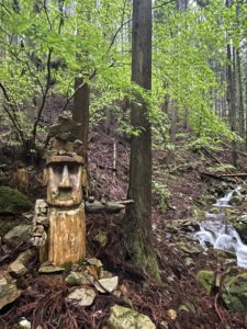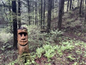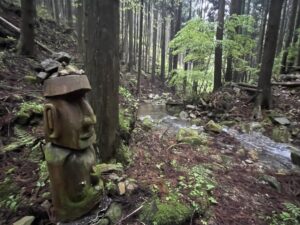 道中には、かわいらしい木製のモアイ像がハイカーを見守るように置かれているところも!こうした小さな発見も、トレイルの楽しみの一つですね。