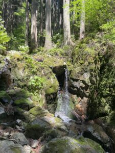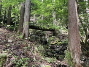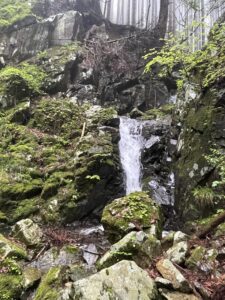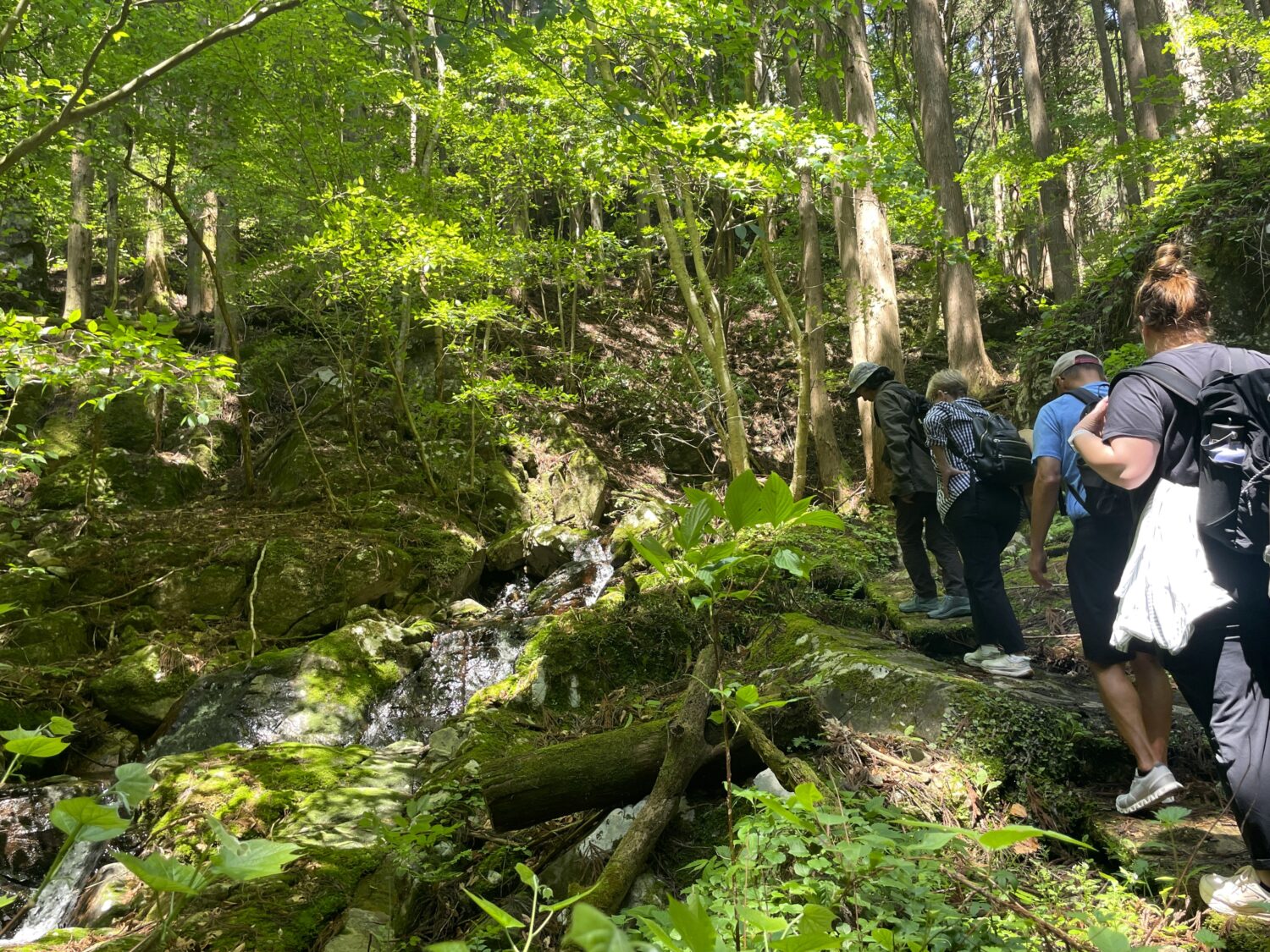 行者の道はその昔、田束山が信仰の山として栄えていた頃、行者(山伏)たちが修行のために利用したとされる歴史ある道です。沢沿いの道を歩き、水の音に耳を傾けながら、苔むした岩の間を縫うように進みます。