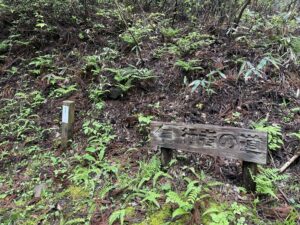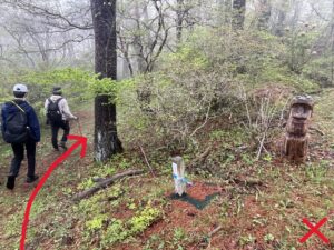 - 少し進むと左に小道が。トレイルの杭とモアイの置物が目印です。