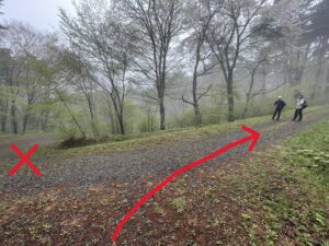 車道を渡ると、山頂までの坂道が見えます。お手洗いは山頂にはありませんので、渡った先にあるお手洗いをご利用ください。