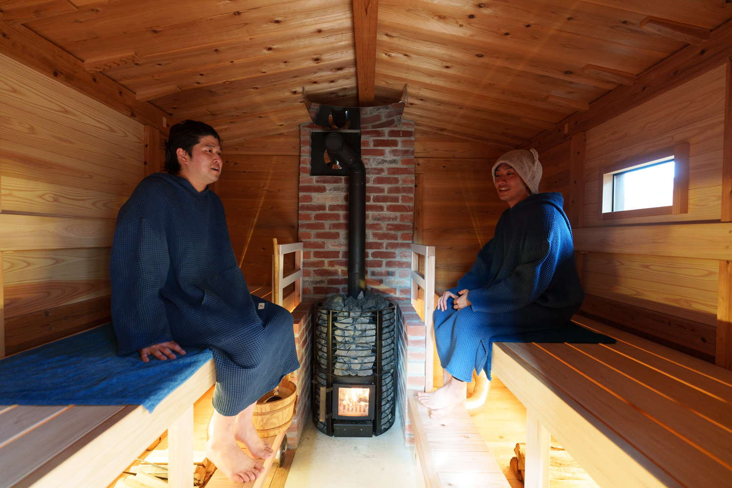 サウナ室の内装には南三陸産FSCの杉材を使用し、「でんでんむしカンパニー」の南三陸産藍染めのサウナマットなど、町の魅力を随所に散りばめています。