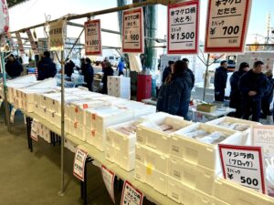 会場には、新鮮な魚介類をはじめ、加工品など南三陸の海の幸がずらりと並びました。年末年始の食卓に向けて、品定めをしながら買い物を楽しむ来場者の姿が多く見られました。