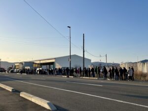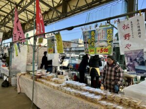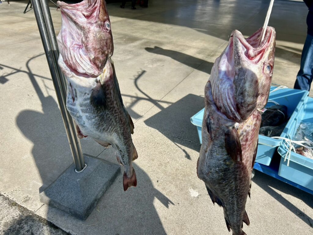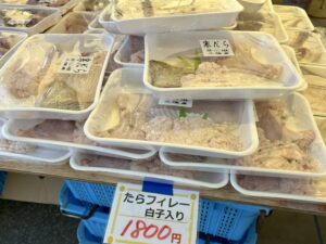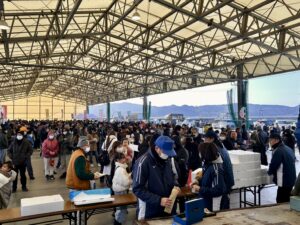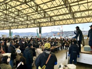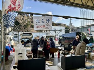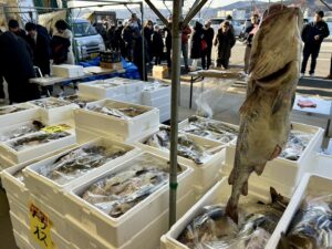 朝から冷え込み風が強い日でしたが、会場の志津川仮設魚市場には早くから人が集まり、寒鱈の一本売りに並ぶ長い列ができていました。