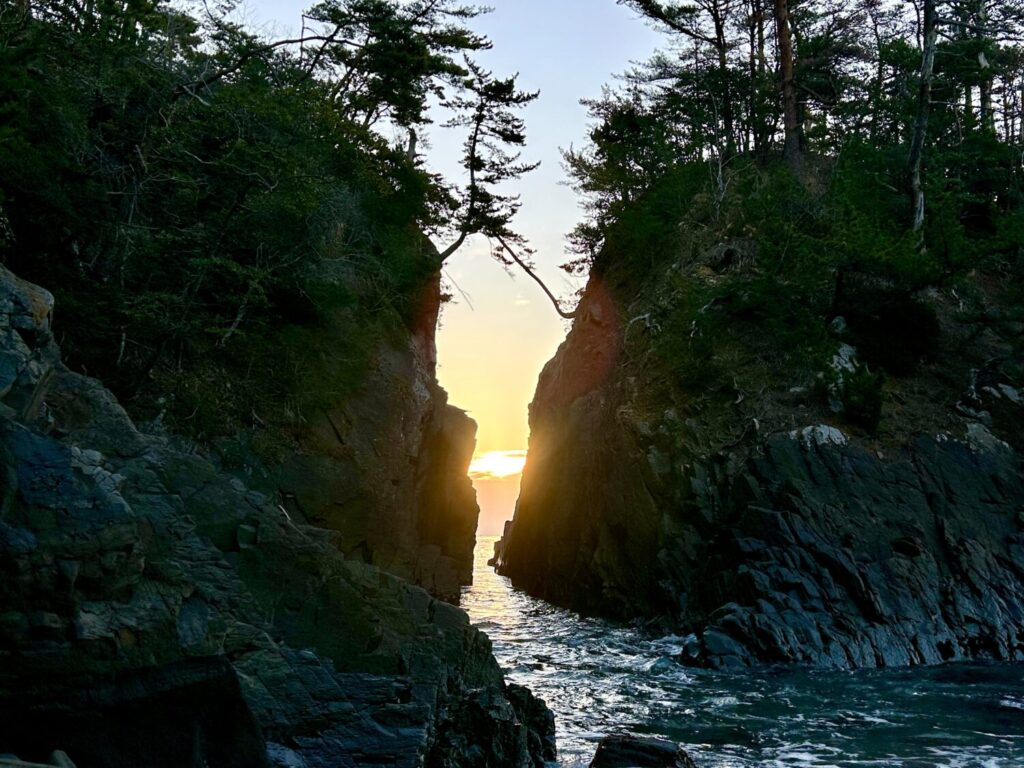 南三陸町戸倉地区にある景勝地「神割崎」では、奇岩の間から日の出が昇る時期(例年2月10日~20日頃)を迎えていました。