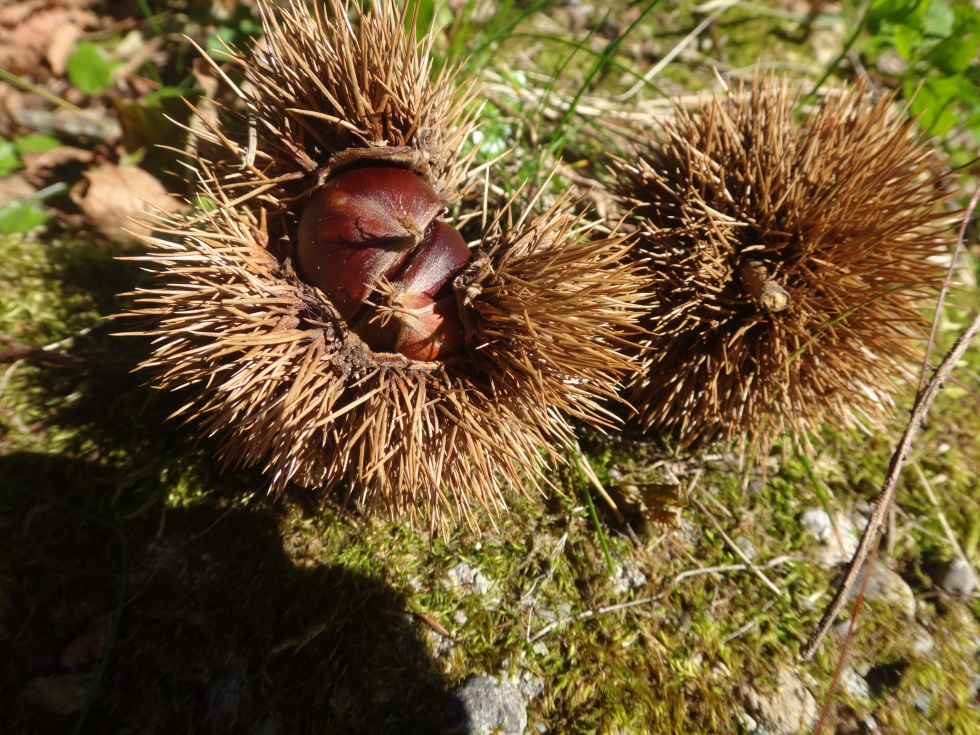 落ち葉の道を少し歩いてみると栗やトンボを見ることができ、