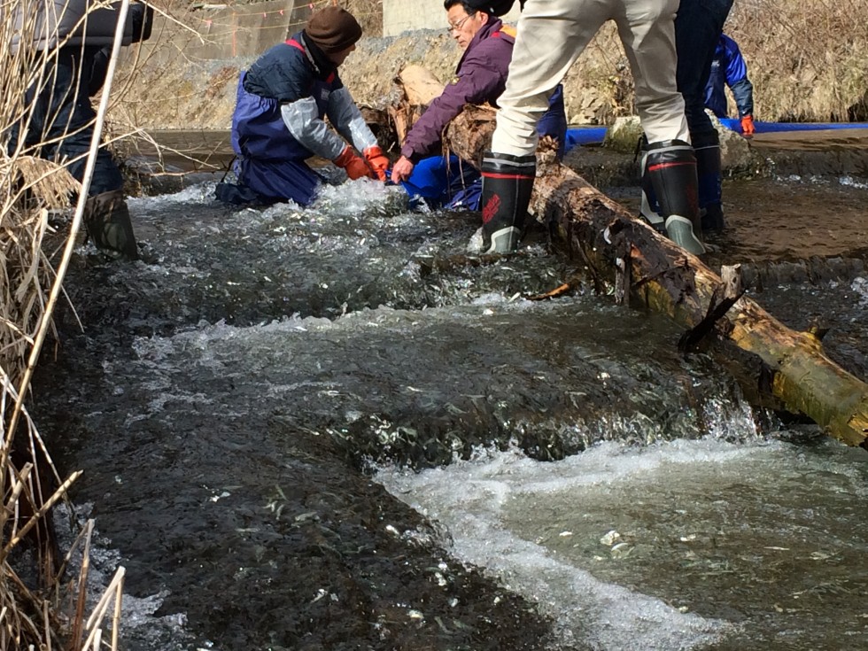 寒さも厳しい2月下旬、南三陸町志津川を流れる八幡川にたくさんのサケの稚魚たちが放流されました。