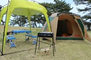 テントには寝袋、マット、ランタン、イス・テーブルセット、BBQ用足つきコンロが準備済み。