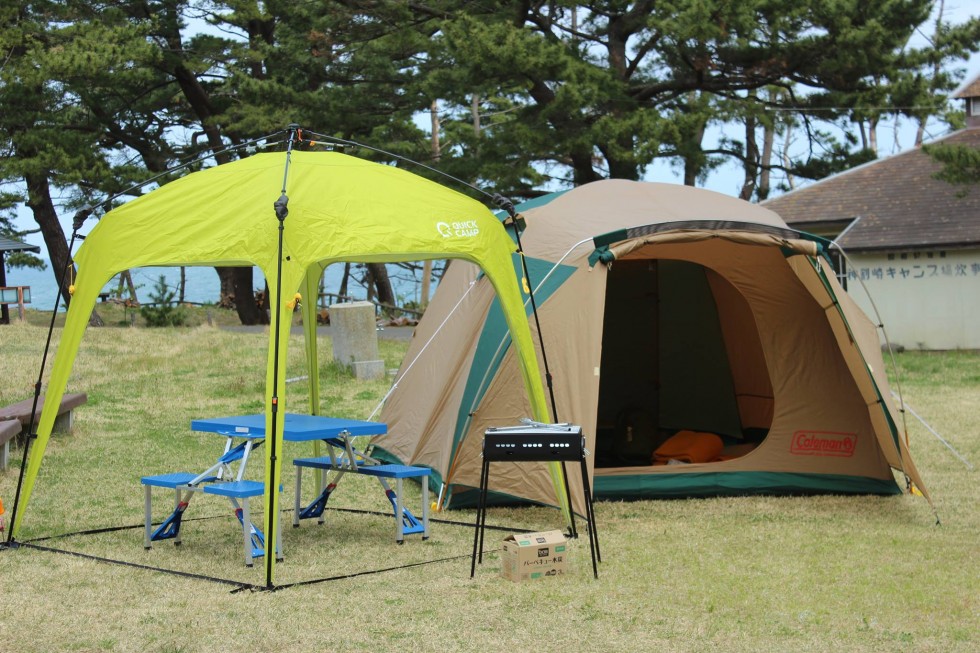 テント、タープ、寝具(寝袋、毛巾)、ランタン、炭、調理器具、食器類