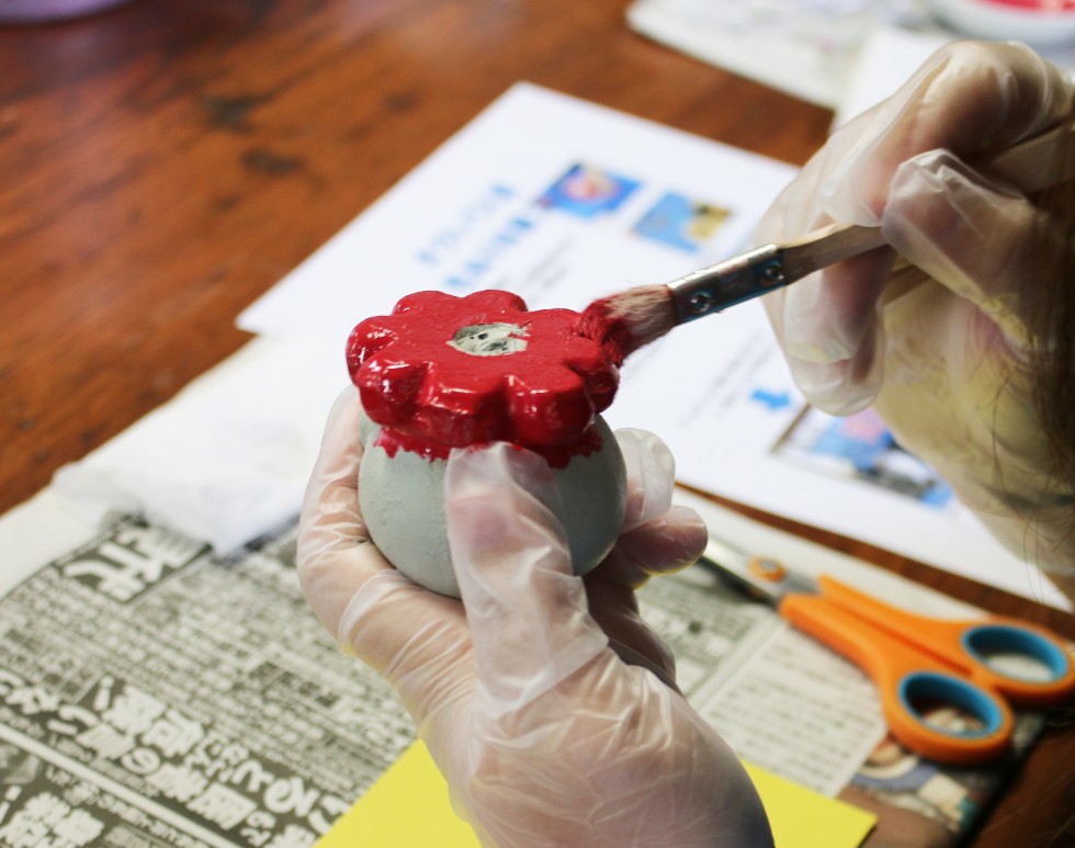 ⇓色が塗られていない状態のオクトパス君の文鎮に赤い塗料を足の部分から塗っていきます。