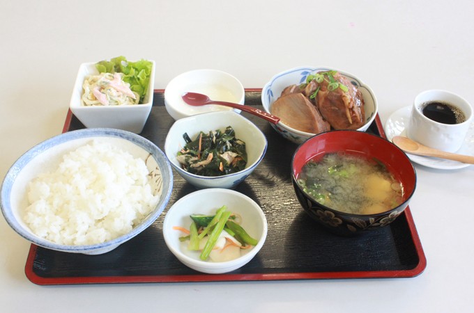 メカのカマ煮、ご飯、お味噌汁、小鉢、漬物、デザート、コーヒーがついて1000円と、