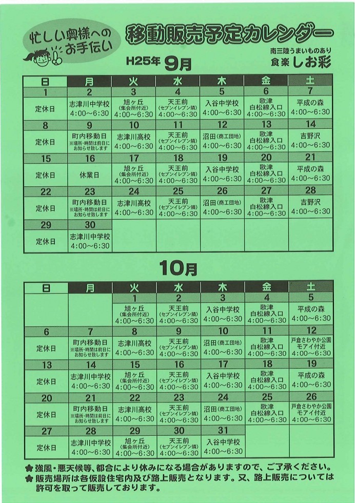 移動販売の日程は、下図の移動販売予定カレンダー をご参考ください。