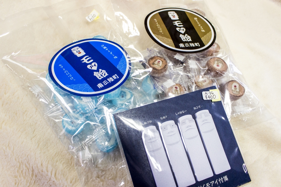 モアイ飴(ソーダ・チョコ)各¥500、モアイ付箋¥400
