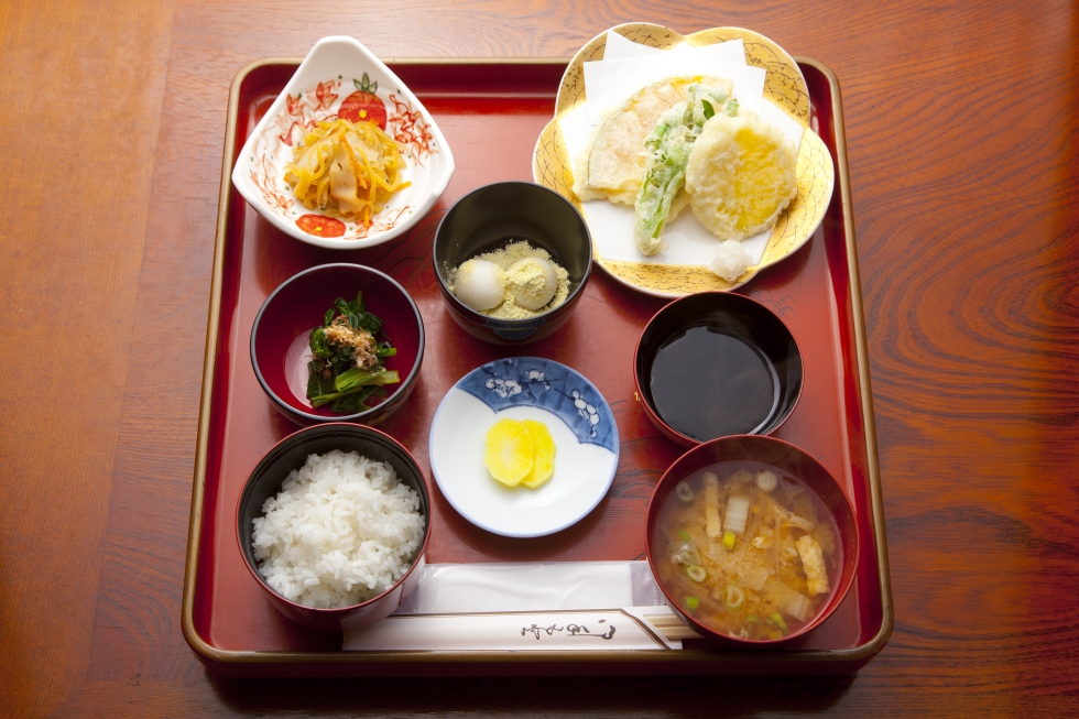 ひころの里の奥座敷では、予約にてお膳に載ったランチを提供している。地元の食材ばっかりを使っているので「ばっかり茶家」と名付けられた農家レストランである。切り盛りするのは入谷地区の農家の女性たち、ひころレディースだ。メンバーが自分で育てた様々な食材を持ち寄り、集まった食材によってメニューが決められる。それぞれの得意料理が、漆塗りのお椀に盛られて美しいお膳に並ぶ。