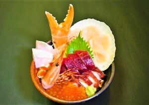 南三陸の新鮮な食材を使用した海鮮丼は、復活した地元の帆立、名物のタコ、イクラ、白身魚など仕上げた一品。