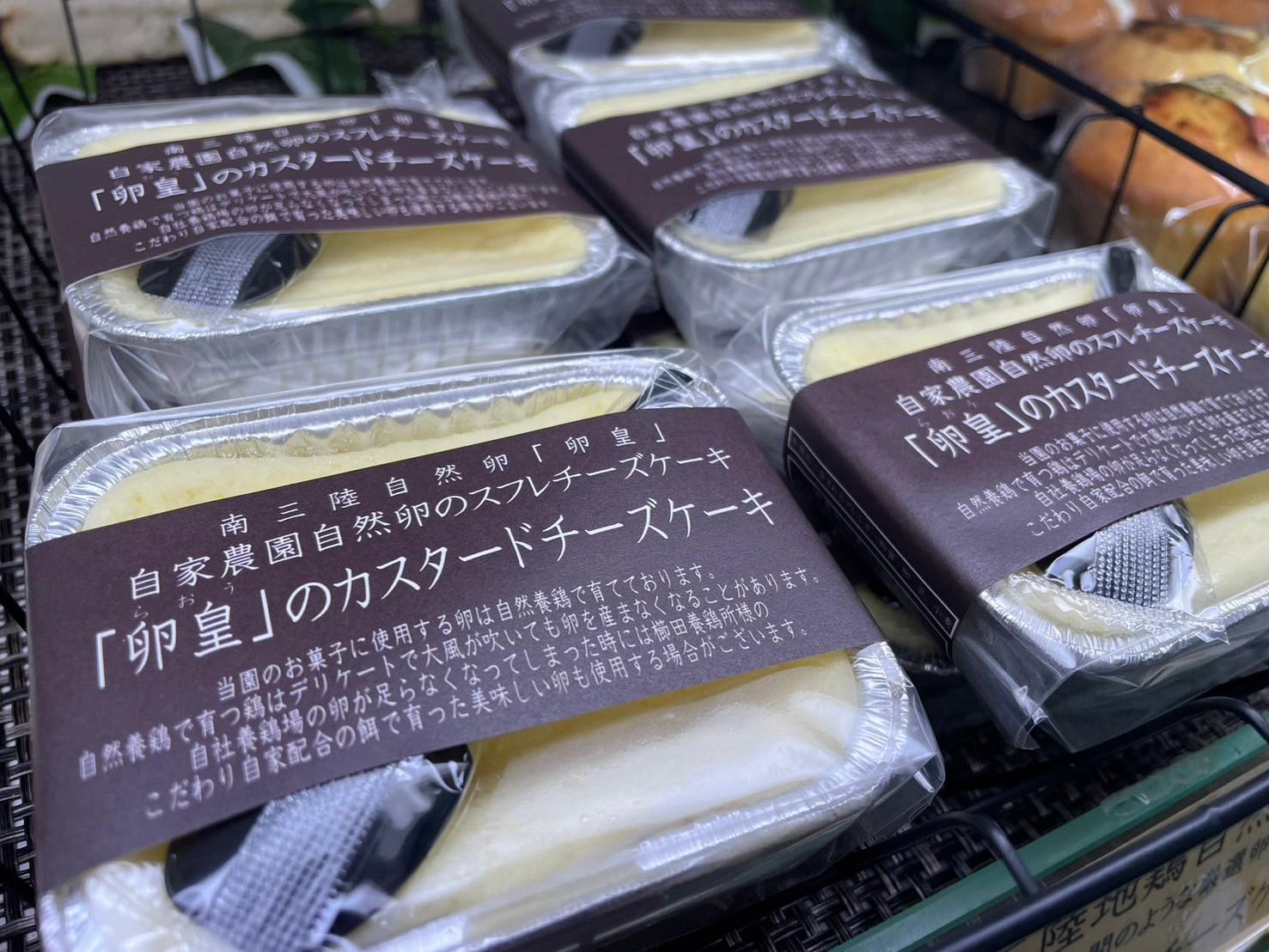 南三陸町の田束山麓で育てられた自然卵「卵皇(らおう)」からつくられるスイーツは大人気商品。特に、「卵皇」の生カスタードケーキはさんさん市場のみ販売されているレアな商品です。