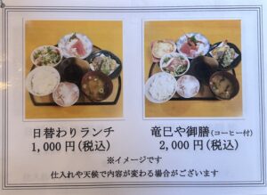 日替わりランチメニューや、竜巳や御膳(コーヒー付)など、定食メニューもあります。