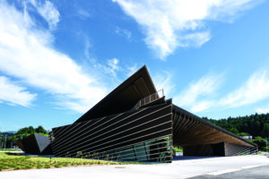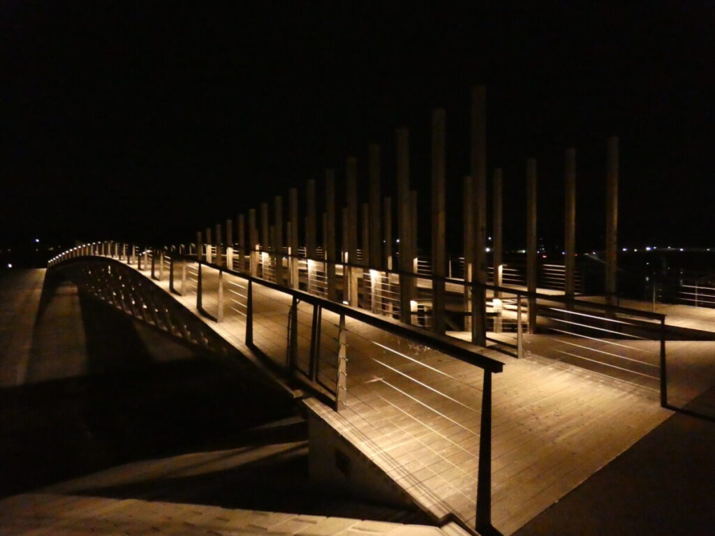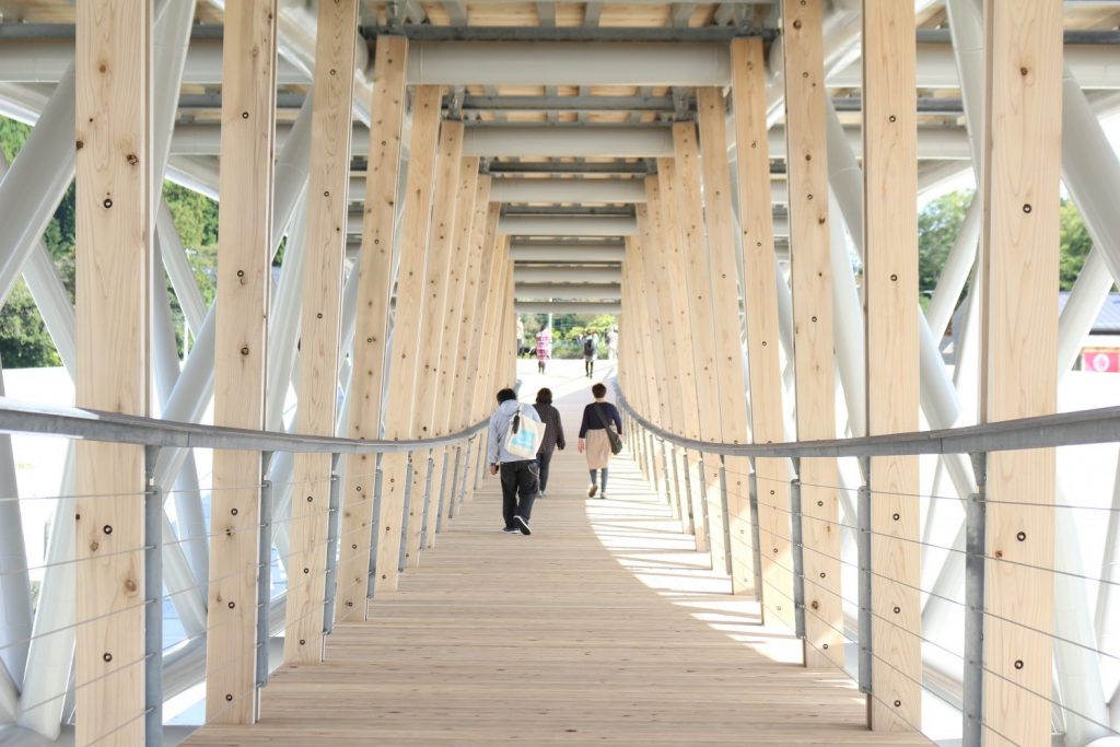 橋を構成するのは、地元産の杉材。昼間は木の隙間からこぼれる光が美しく、夕暮れ時にはシルエットが幻想的に浮かび上がる。