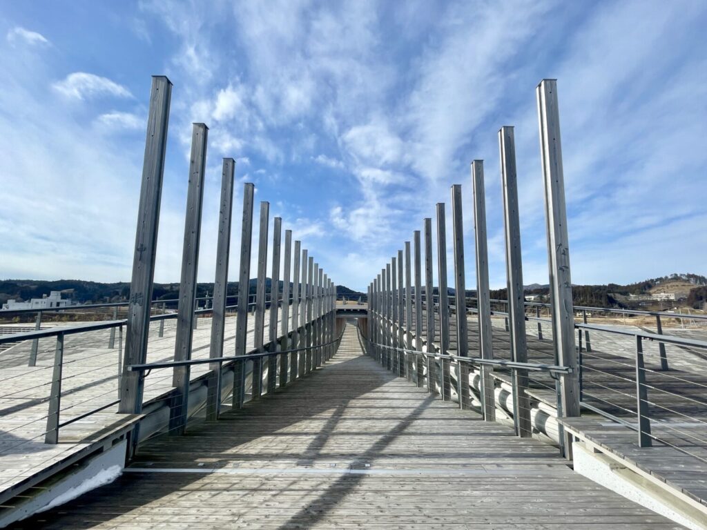 まずは、鳥居のような柱が並ぶ下の道を通り、対岸へ。帰りは上の道を通り、南三陸の風を感じながら再び街側へと戻ります。この往復の歩みの中で、土地の歴史と新しい街の息吹、その両方を一度に体感することができます。