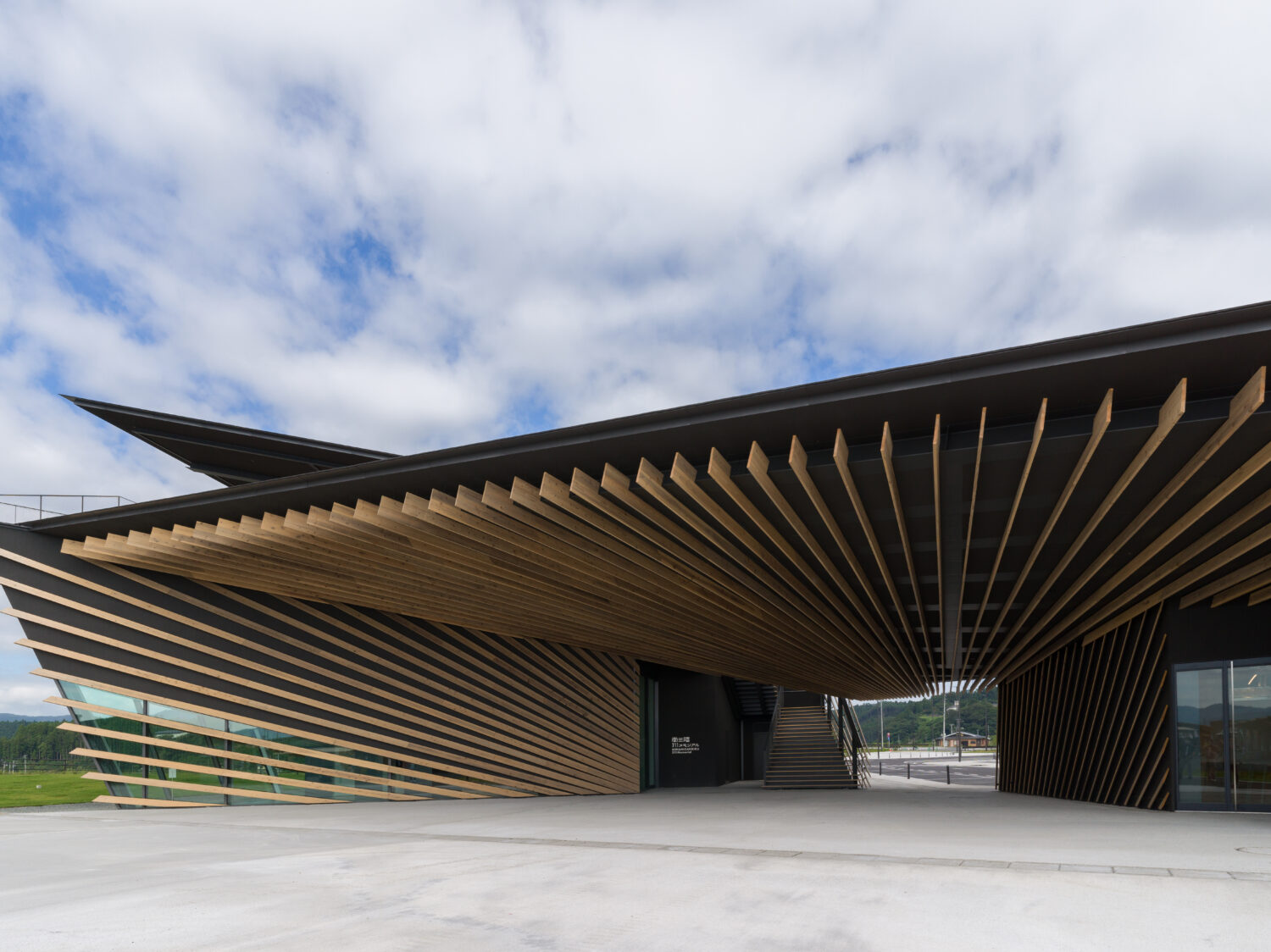 特徴的な建物は、国立競技場も手掛けた隈研吾氏が建築設計。南三陸杉をふんだんに使ったデザインです。隈研吾氏は13年から南三陸のグランドデザインを考え、メモリアルの建物のみでなく、さんさん商店街、復興祈念公園へ続く中橋など含めてトータルでデザインしている。伝承施設である南三陸311メモリアルは、海への流れ、山への流れ、時間の流れをつなぐことをテーマにしてデザインされた。