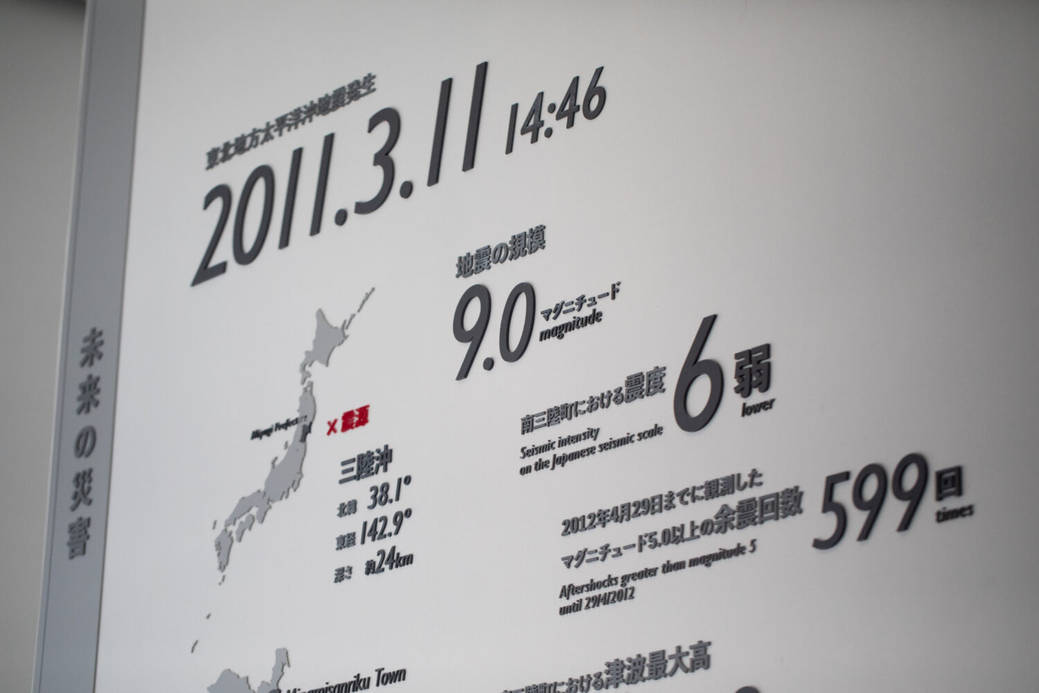 南三陸町の被害状況をデータを基に展示をしています。実際にどんな被害があったのか客観的な数字的データで理解していただけます。当時の津波到達地点も示されているので、当時の様子がより分かると思います。