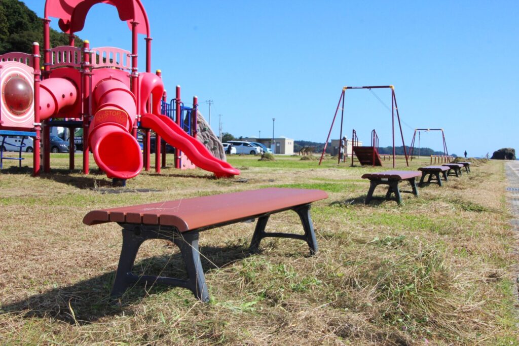 遊具付近にはベンチもあり、お子さんが遊んでいる姿をゆっくりと見守ることができます。