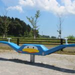 可愛らしいイラストが描かれたシーソーとスイング遊具。