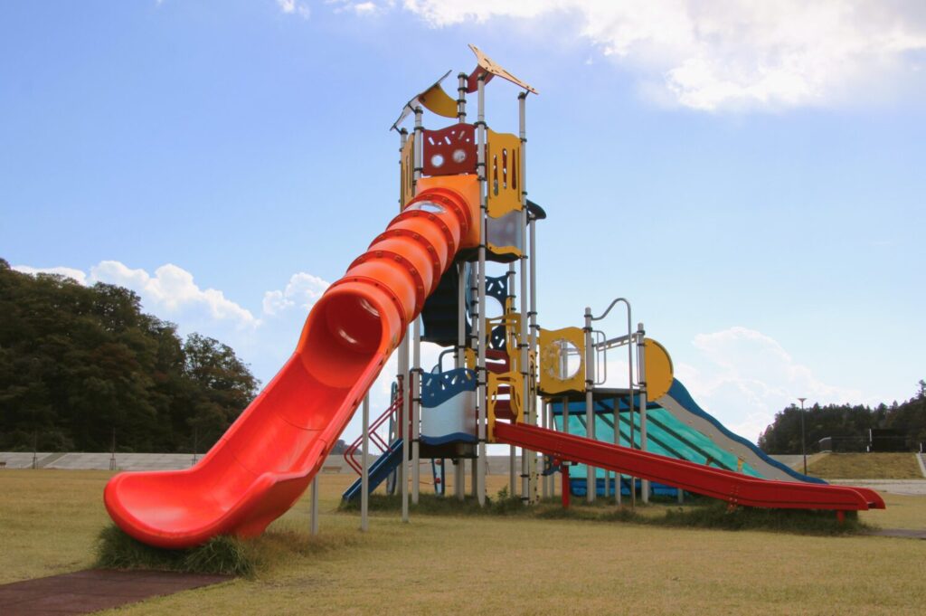 広場には、3台ものすべり台が備わった複合遊具があります。