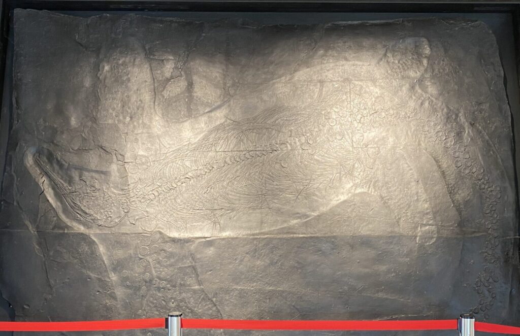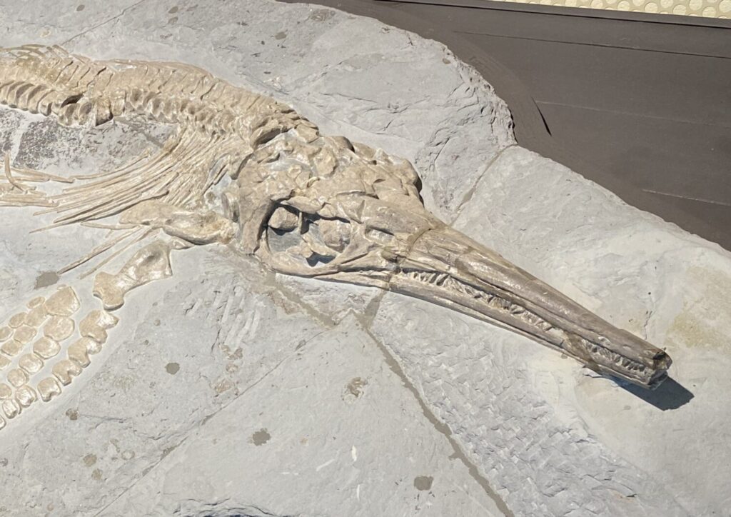 イタリアから取り寄せられたベサノサウルス、ドイツで発見されたステノプテリュギウス、その迫力ある全身骨格を観察することも。
