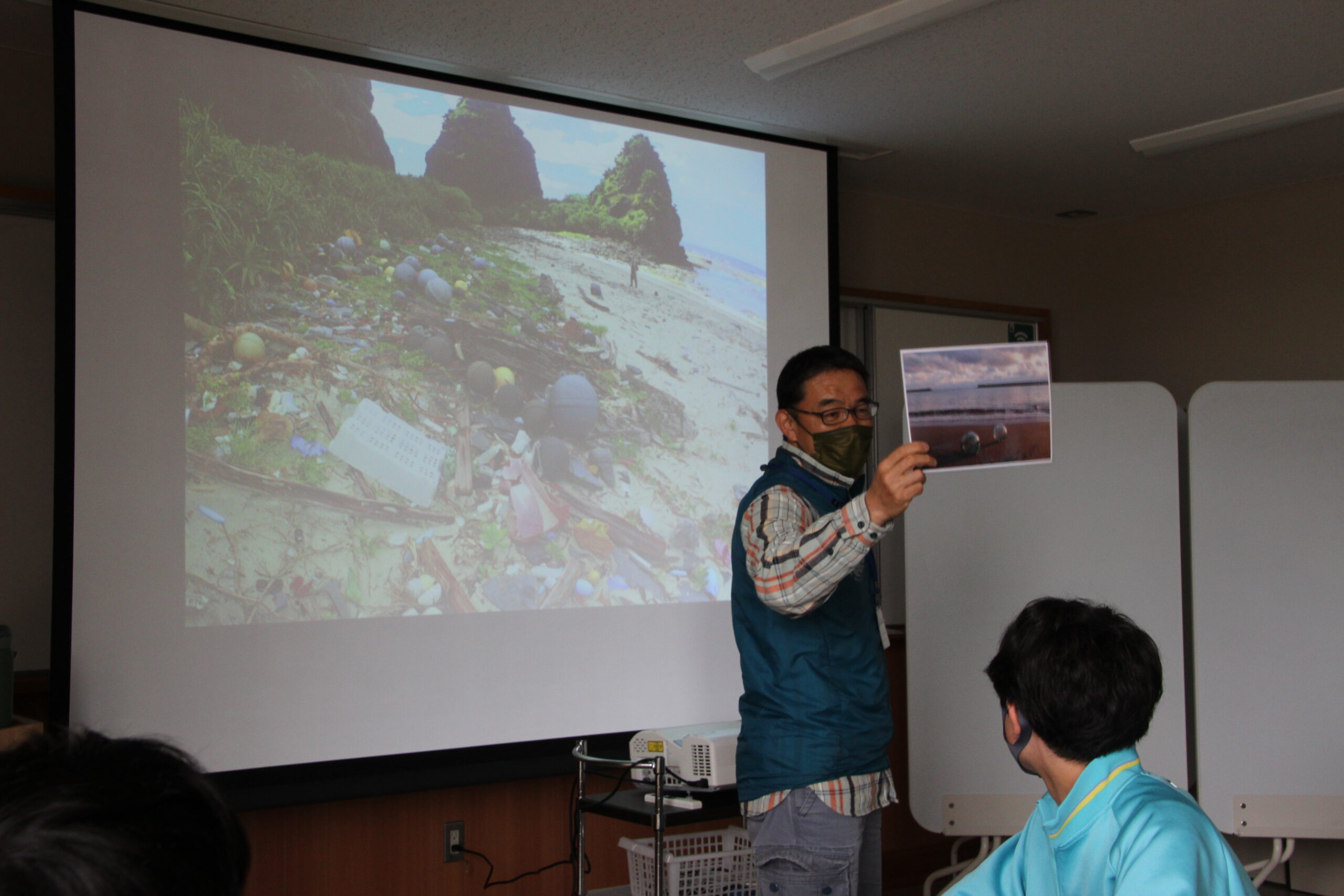 息をのむような美しい海の写真の中に、海には似合わないものたちが多く映っている写真が生徒の元には1枚ずつありました。平井さんが以前に活動されていた沖縄の西表島で撮影した20年前の写真。西表島といえば、原生林があり豊かな自然が残っている場所。