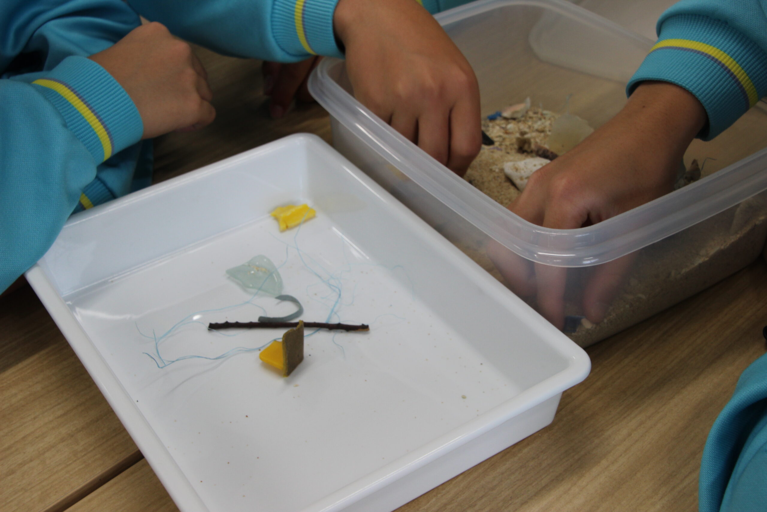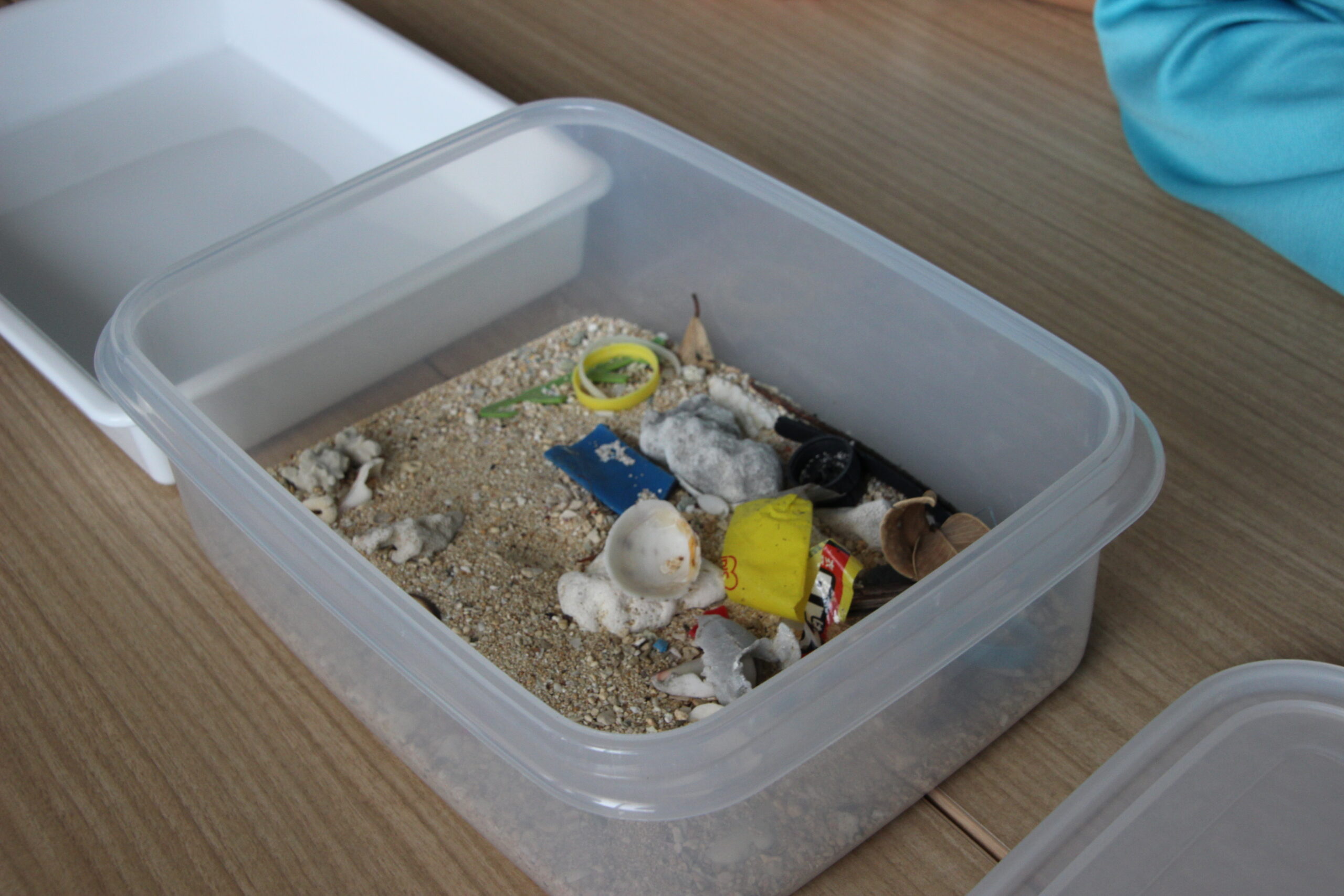 実際に写真で見るだけでなく、生徒のグループそれぞれに実際の砂浜が入った小さなバケツが用意されていました。これを「小さなビーチ」とし、平井さんからミッションが与えられました。それはこのビーチの中からゴミを選別すること。
