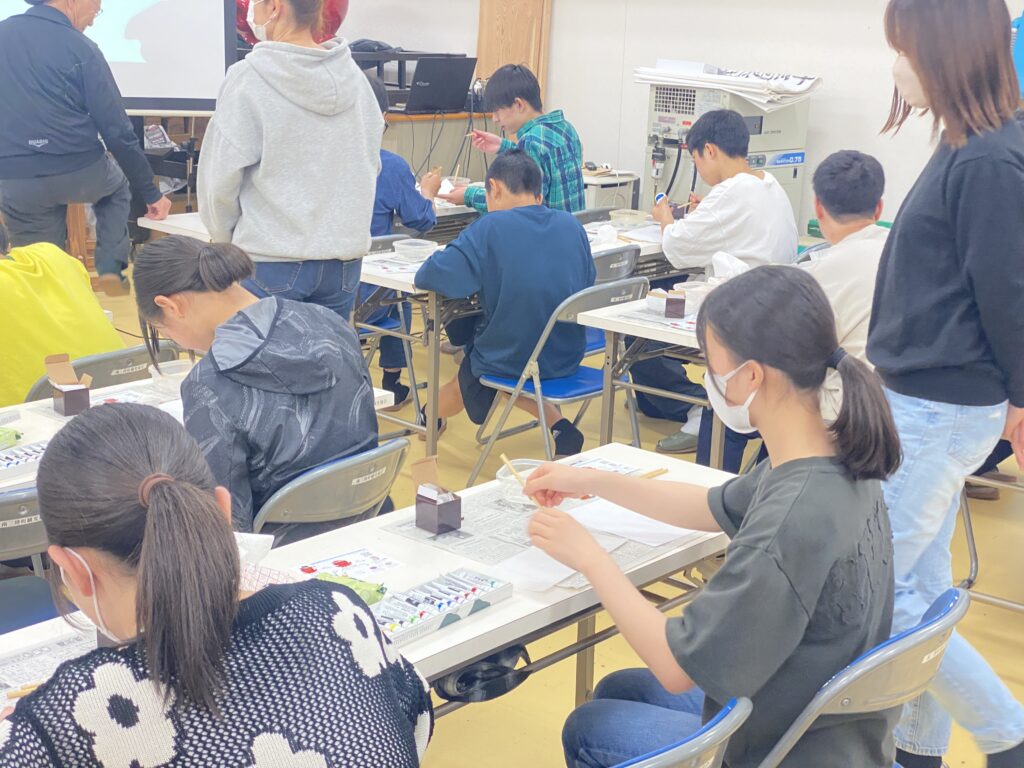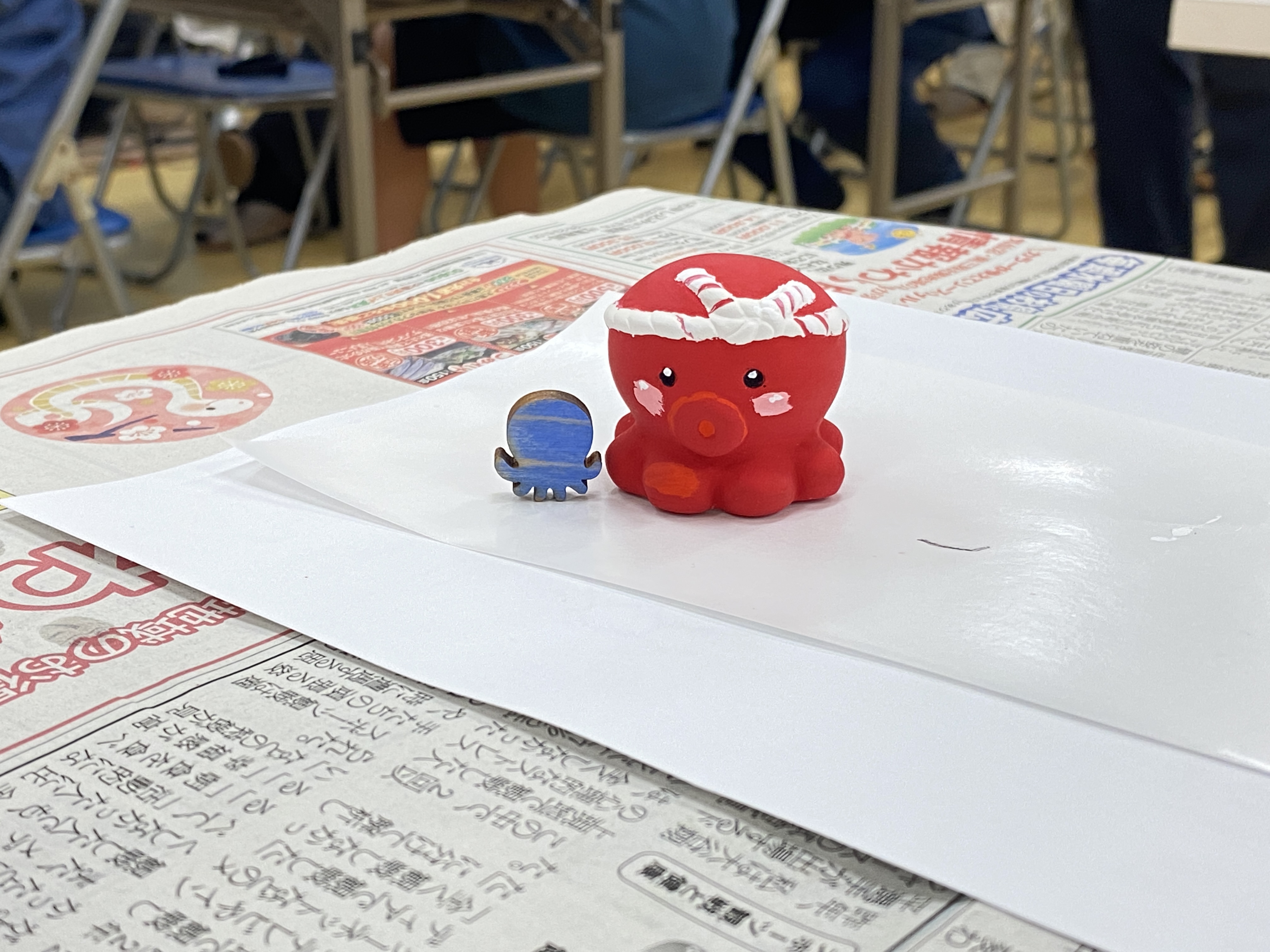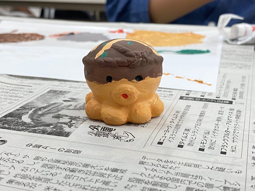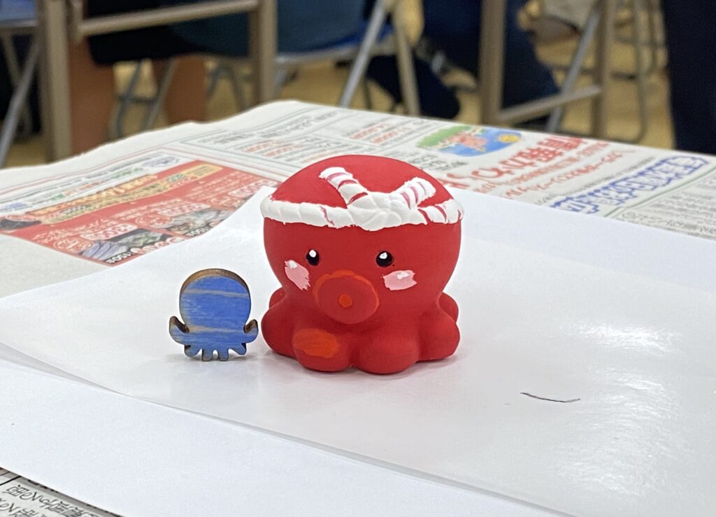 体験では、生徒の皆さんに真っ白なタコロンへ思い思いの色を塗っていただきました。真っ赤でかわいらしいタコや、ユニークな発想で“タコ焼き風”に仕上げる作品も見られ、個性豊かなタコロンたちが並びました。