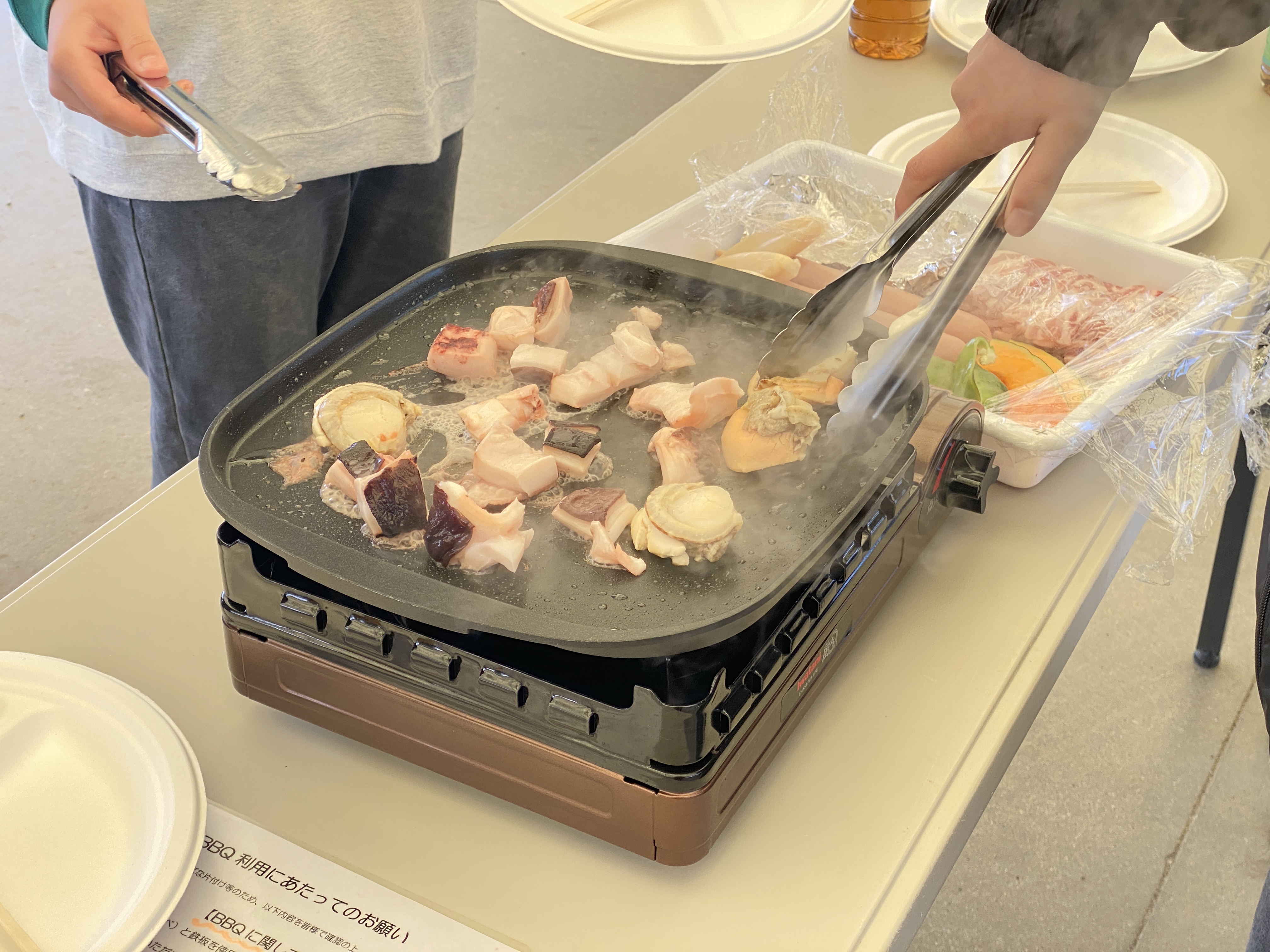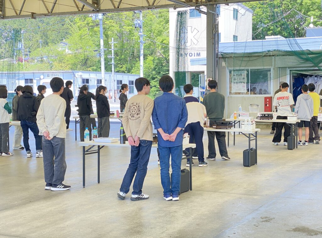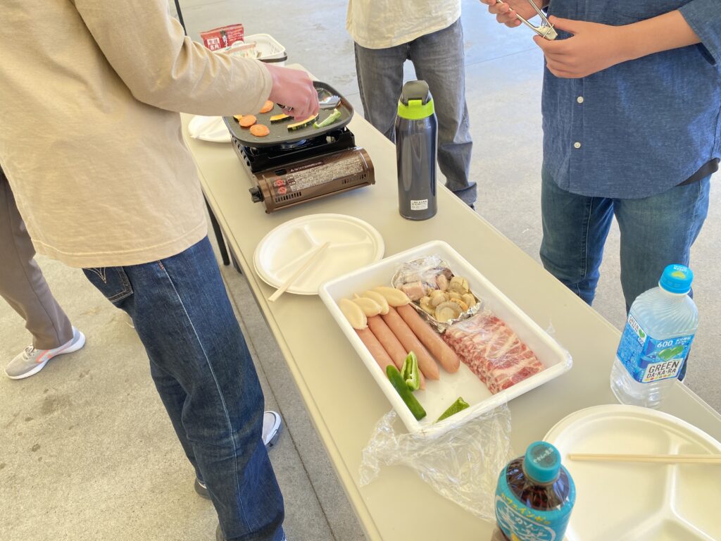BBQではお肉や野菜に加えて、南三陸町ならではの新鮮な海の幸――特にタコなどの海鮮食材も用意されました。午前中のタコロン絵付け体験で学んだ「南三陸町とタコのつながり」に思いを馳せつつ、生徒の皆さんには和やかな雰囲気の中で食事を楽しんでいただけたと思います。