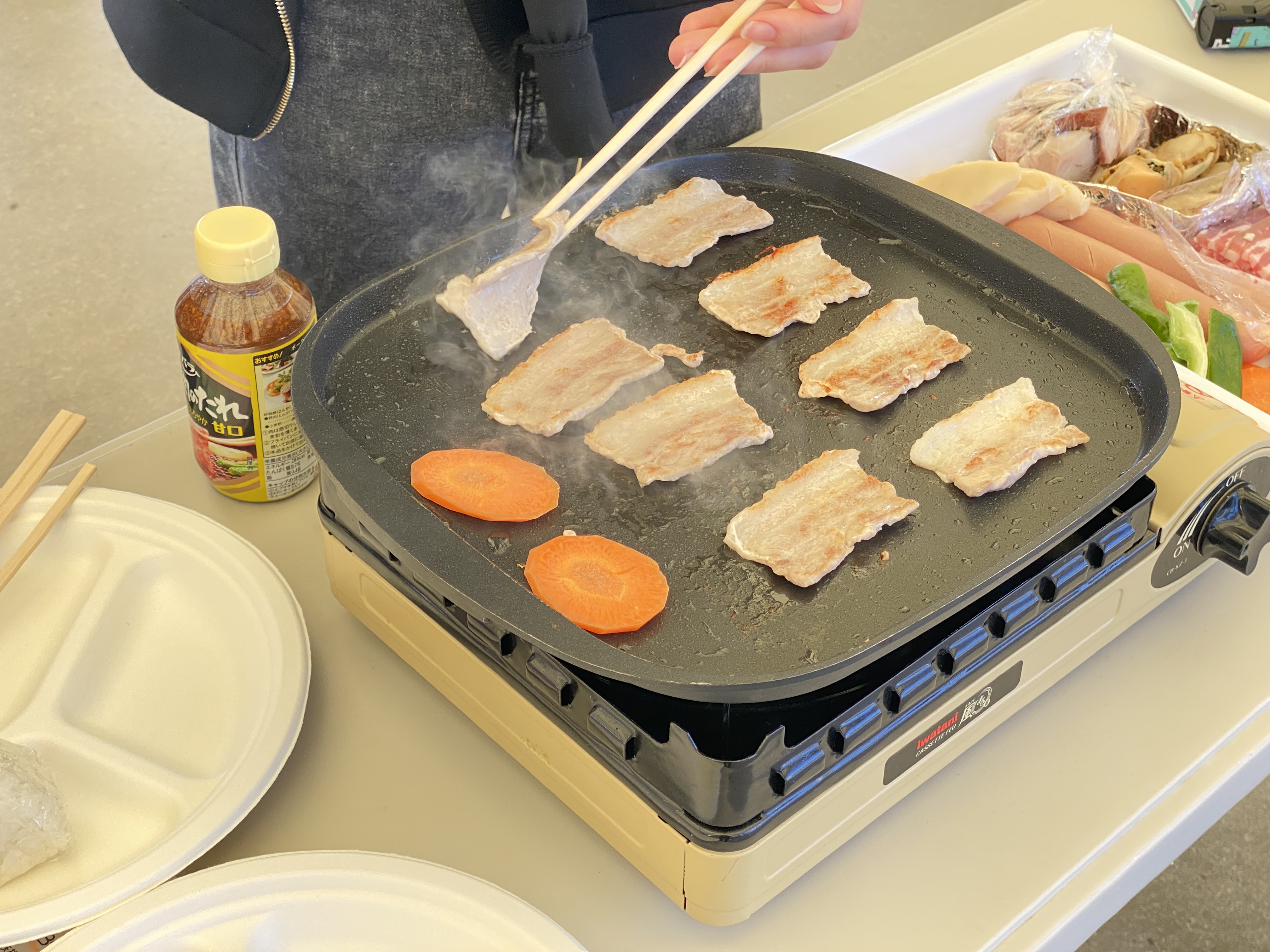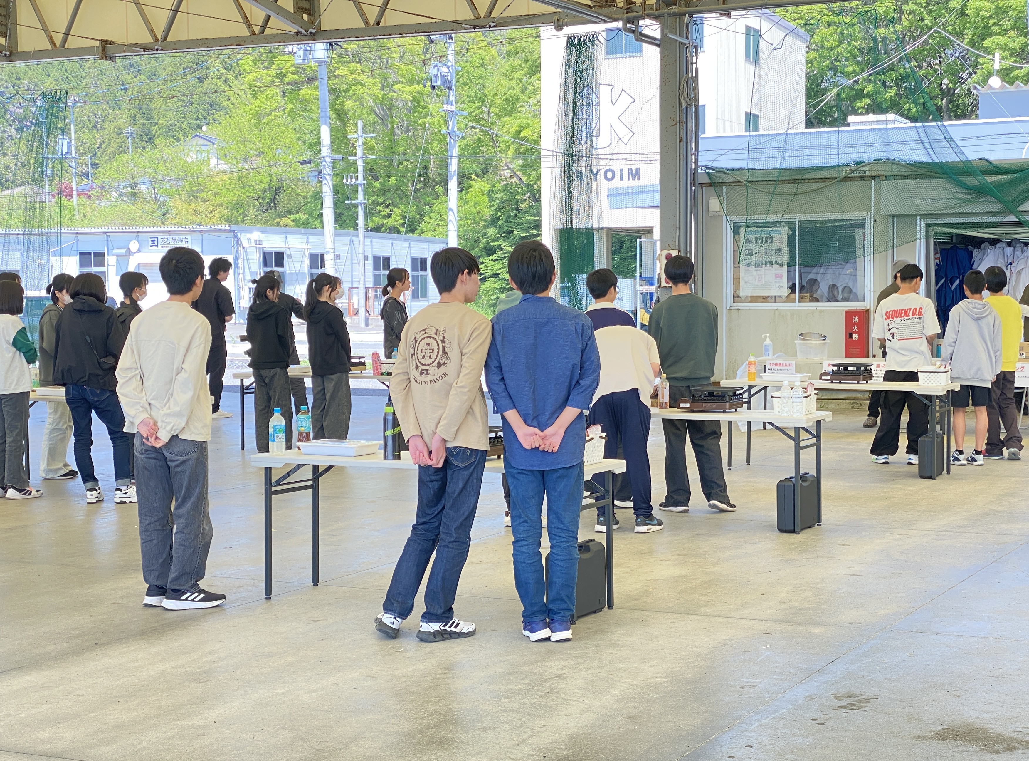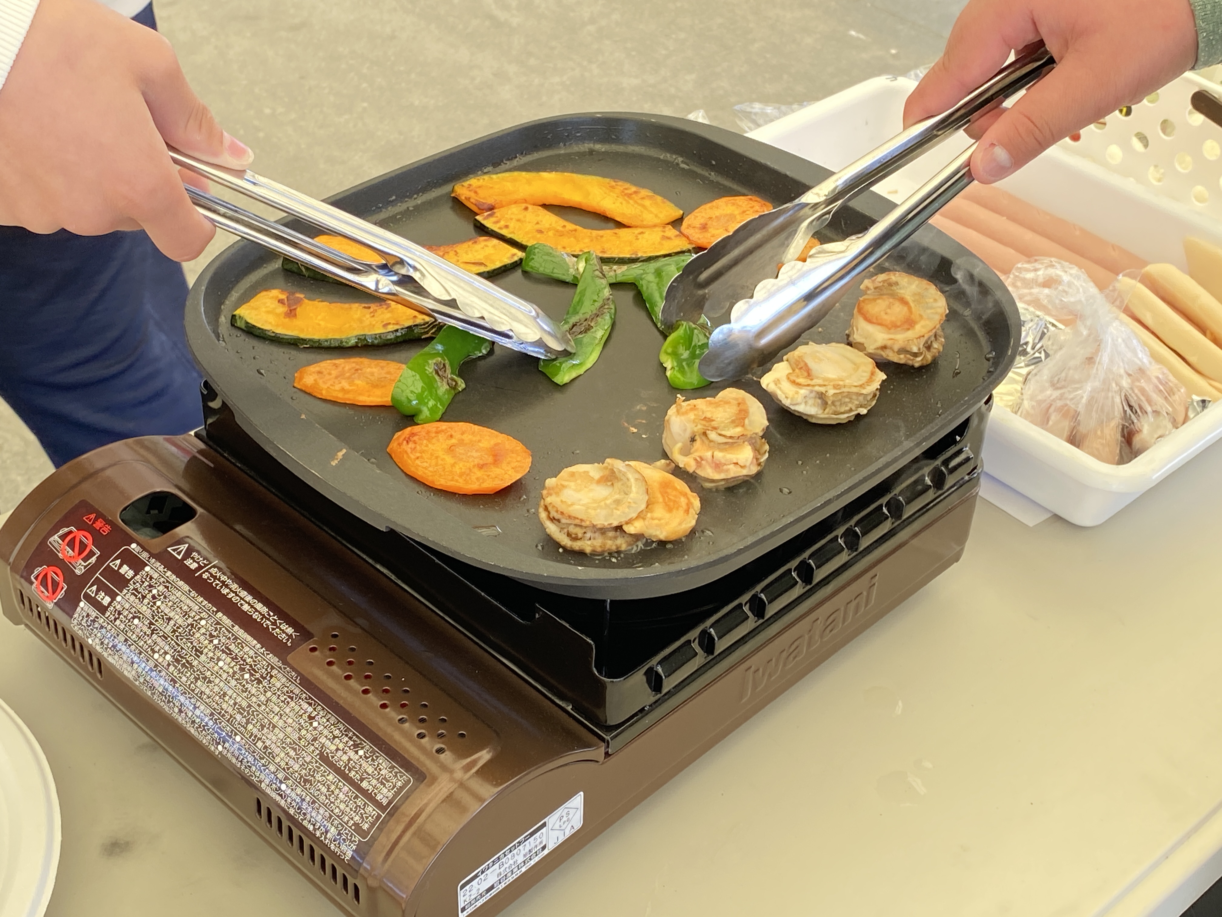 BBQではお肉や野菜に加えて、南三陸町ならではの新鮮な海の幸――特にタコなどの海鮮食材も用意されました。午前中のタコロン絵付け体験で学んだ「南三陸町とタコのつながり」に思いを馳せつつ、生徒の皆さんには和やかな雰囲気の中で食事を楽しんでいただけたと思います。
