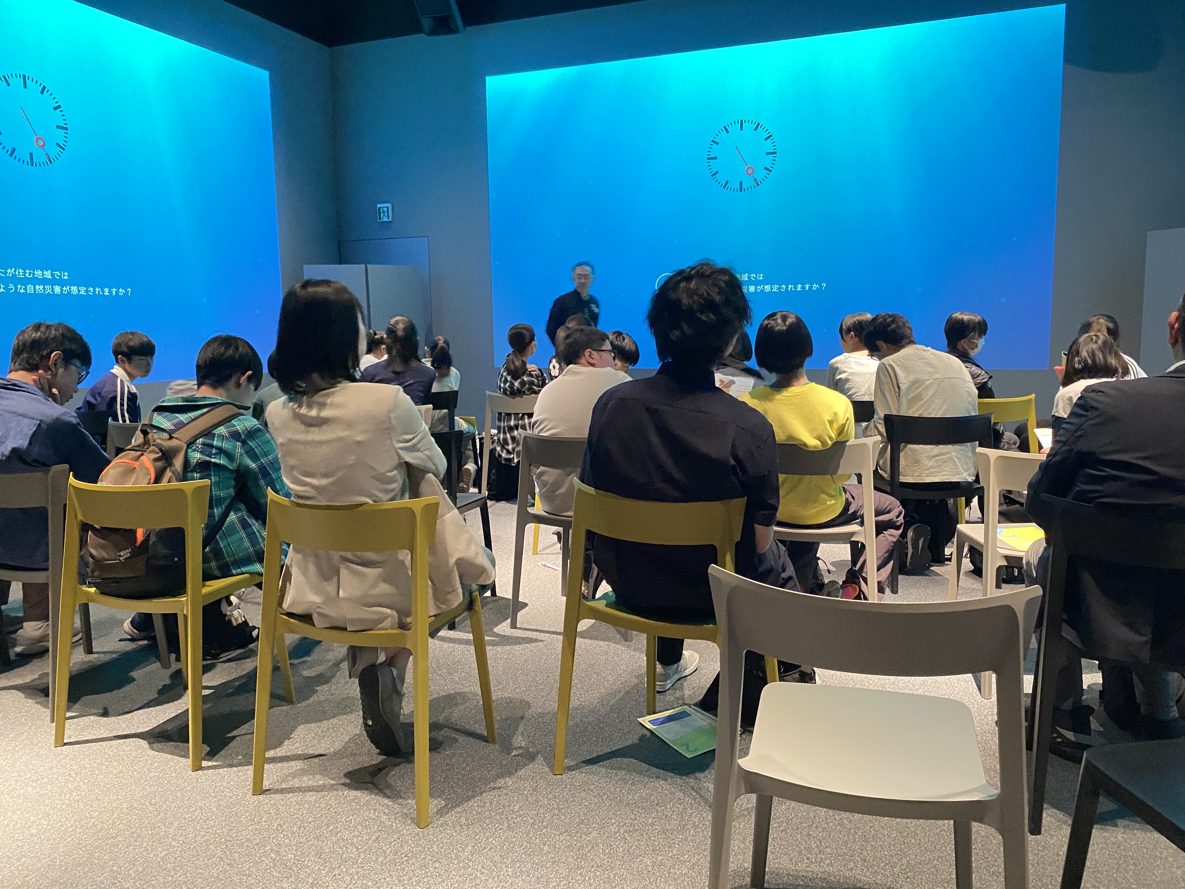 映像の合間には「自分の命を守るためには何が必要か」というテーマのもと、万が一に備えた意識が自分にあるのか、今後どのように行動していくべきかを考えるディスカッションが始まります。近くに座る人と熱心に言葉を交わしながら、自分の立場に置き換えて真剣に考える生徒たちの姿がそこにはありました。